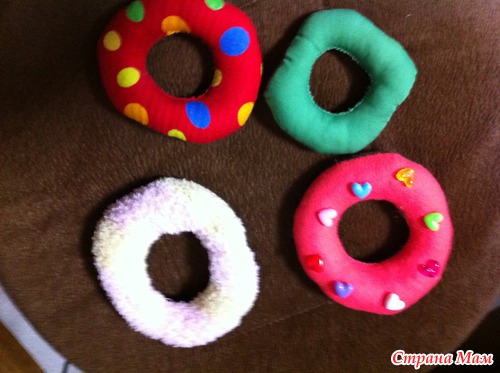 Сидели как-то на днях игрухи в тырнете смотрели, Маруся угледела набор пончиков из флиса, ну и давай стонать, что они ей очень сильно нужны, пришлось сшить, но флиса было маловато, так что только один пончик полностью из флиса, у остальных только низ. Полосатый, самый большой-верх из носка.