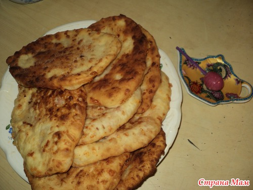 3. Полученное тесто разделить на колобки, раскатать небольшую лепешку (можно пожарить так), положить начинку (у меня - ветчина). Можно положить сыр другого вида, тоже очень вкусно. Тут ваша фантазия! Соединить края и немного раскатать.