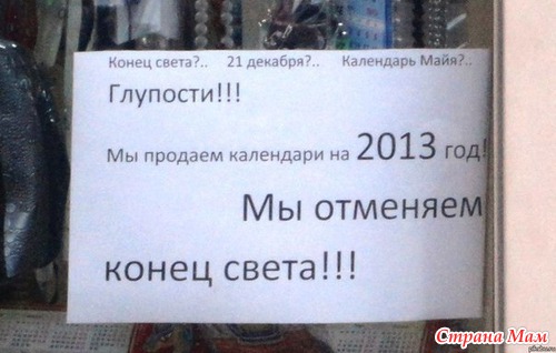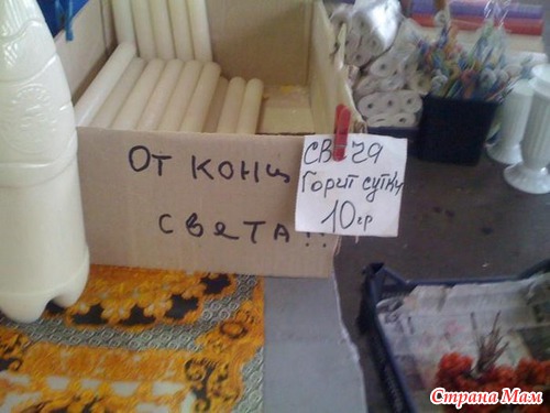 в субботу я за продуктами ездила хожу по магазину с тележкой в переди у меня бабулька с сыном..набирают по списку..увидела бабка свечки и в тележку..сын говорит мам мы ж на новый год закупаем зачем это?она- так конец света сначала..потом новый год..