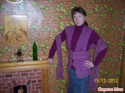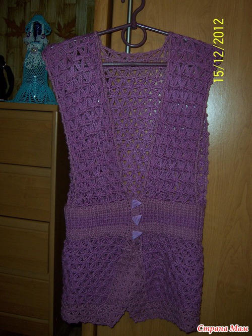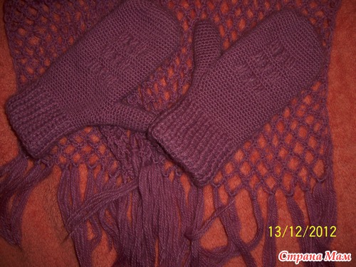 Мне подарили шапку, а к ней связала варежки и шарф. Варежки с подкладкой от старых рукавичек. Шарф соломоновыми петлями ( попробовала первый раз -- вроде получилось). Шарф хоть и ажурный, но обмотав как на фото, - очень тепло. А жилет уже придумала сама. Пояс резинкой( выпуклый- вогнутый столбик), а остальное по схеме шарфа, который я раньше вязала. Пряжа ангора рам (мохер/акрил) 500м в 100 гр. На все ушло почти 3 мотка.