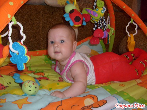 так интересно наблюдать за ней - поднимает головку и плечики, тужится, чтобы сесть, а не может еще