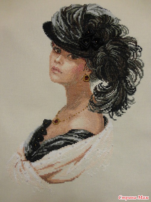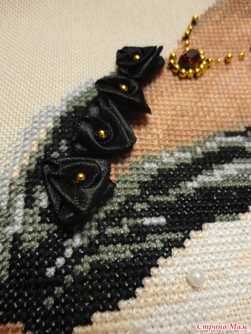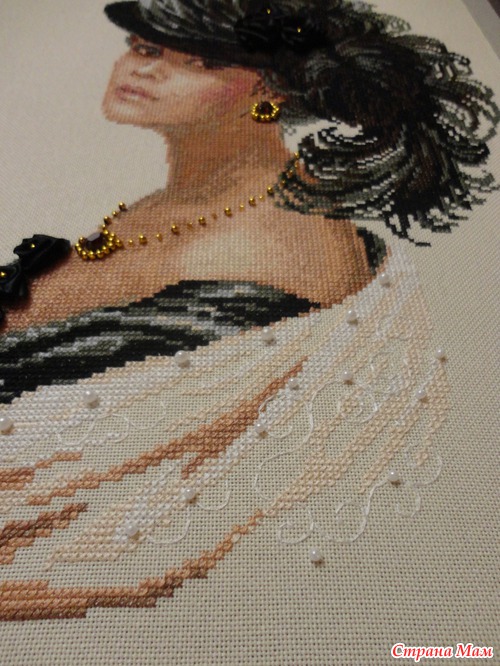Немножко решила внести и своих интересных деталей. В схеме бусин на белой накидке нет, и ещё добавила бэка в виде завитков.