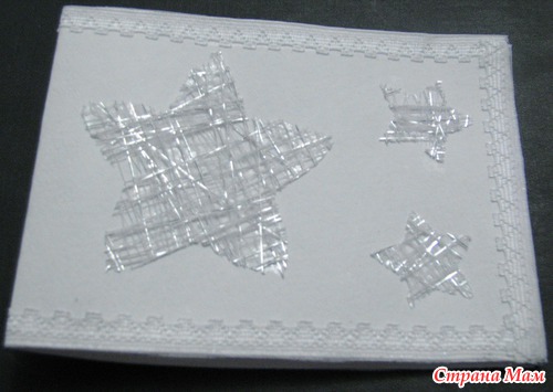 У дочери стащила бумагу для акварели, оклеила края кружевом. Из все той же пластины из ниток вырезала звезды, приклеила. Все просто.