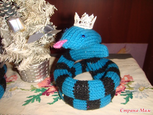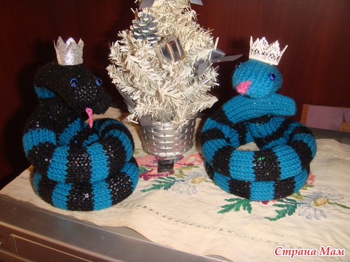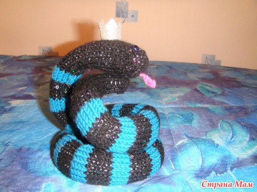 Вот и меня не обошла стороной "змеиная болезнь" - связала символ будущего года в количестве 2 штук (м. б. свяжу еще, пока не знаю). Т. к. змея в 2013 году - черная, водяная - то купила черные нитки с пайетками и люрексом (красиво блестят на солнышке), а нитки цвета морской волны дома были, я из таких сейчас пытаюсь себе кофтушку сваять, да все отвлекаюсь на другие поделки (сапожник без сапог, как говорится). А змейки мои - Царицы, таковыми, по крайней мере, я себе их представляю.