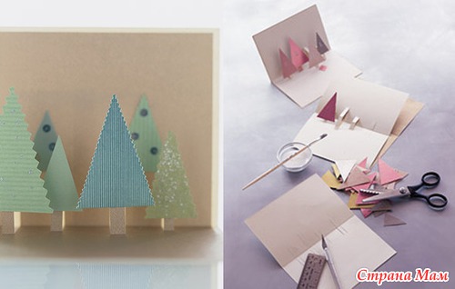 Раскрываем открыточку и начинаем клеить наши оставшиеся елочки