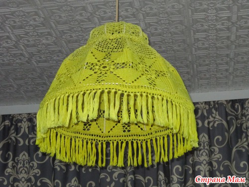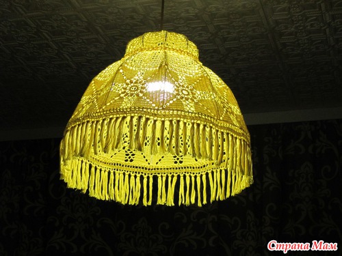 Вот такой вот абажур связала в свою новую кухню ( мы недавно переехали в новую квартиру ). И не спрашивайте меня почему такой жёлтый! )))) При том, что кухня в синих и емчужно-серых оттенках. Хочется чего то яркого и солнечного... Может змняя депрессия??? Сейчас работаю над филейной занавеской во всё окно, на которой изображено солнце. Схему нашла тут, в СТРАНЕ МАМ. Очень скоро буду хвастаться вновь )))