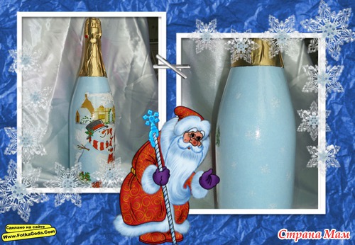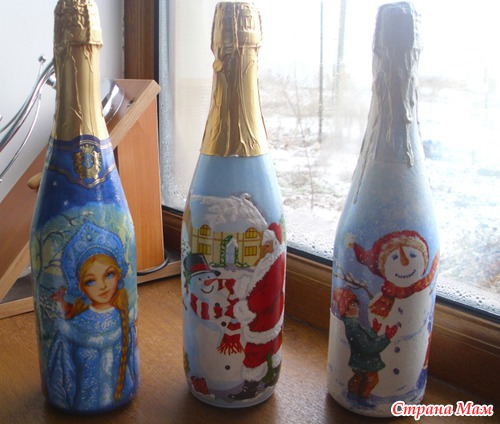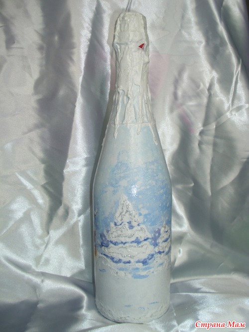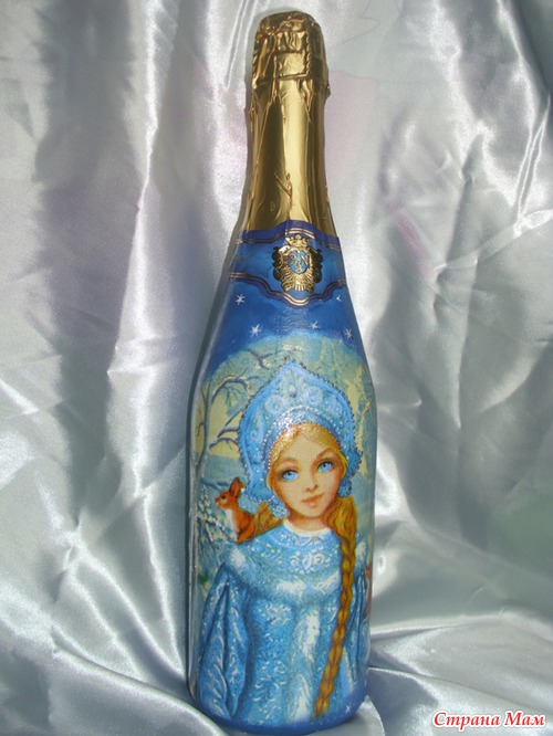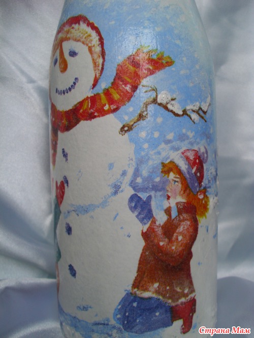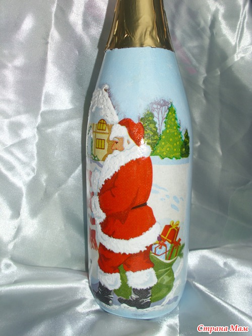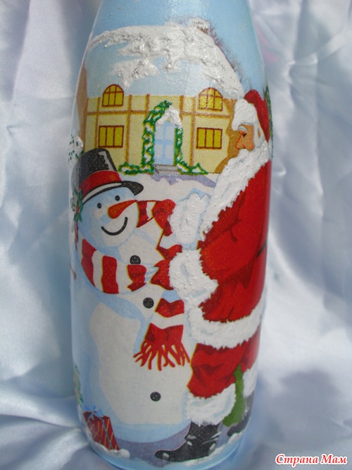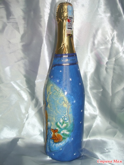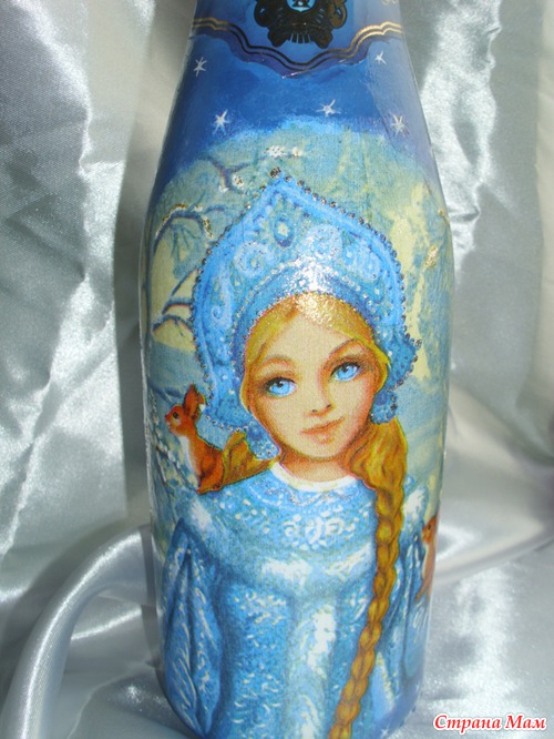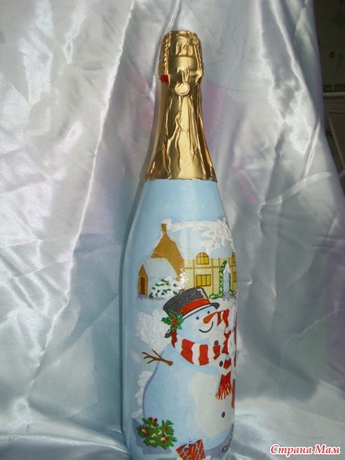 Двое суток декупажила, отрывалась только что бы семью накормить. Ложилась спать в 05.00 утра, просыпалась и снова за бутылки. Сделала три штуки, и все, больше не могу. Можно сказать надорвалась, куда торопилась не пойму, ну уж очень увлекателен был процесс. Осталось еще три бутылки, так два дня не могу на их сторону смотреть. Надеюсь как высплюсь и отдохну продолжу, так как очень люблю это дело-декупаж!