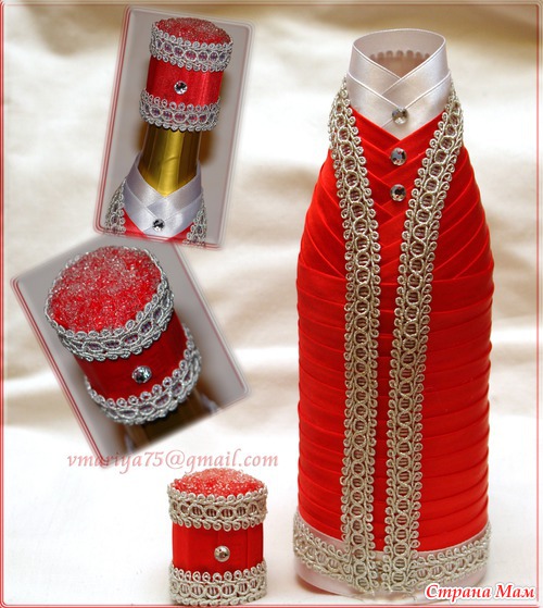 Это моя первая бутылочка!! И съемная!! Но фишка оказалась в том, что снять-то ее легко было, а потом, убрав полиэтилен, на который наклеивала ленты, надеть обратно на бутылку оказалось довольно непросто... Так что еще надо подумать, насколько это вообще целесообразно - съемную одежку для бутылок делать