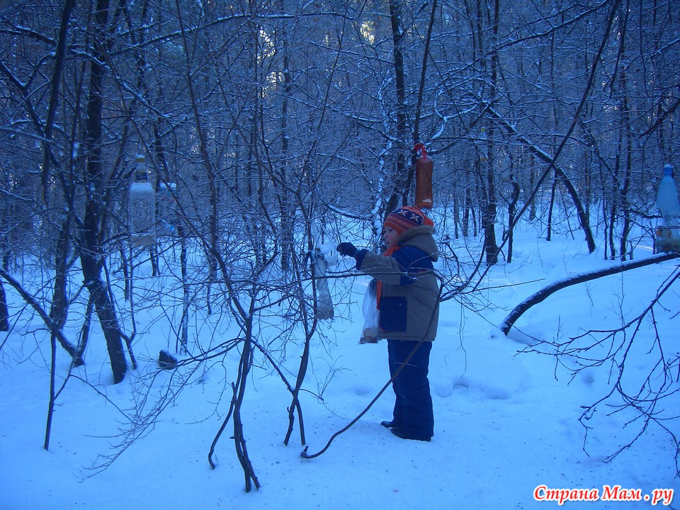 У нас в лесу есть место, где висит много кормушек для птиц, и все желающие приносят им корм. Мы тоже не упустили возможность покормить птичек: