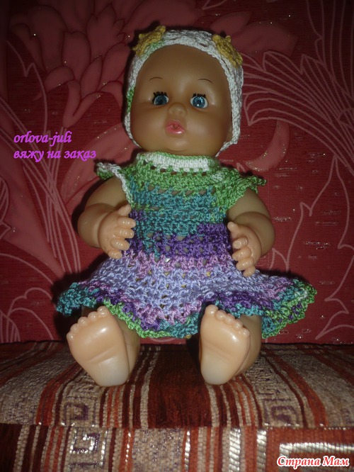 В очередной раз позвонив мне постоянная клиентка пришла ко мне и каково было мое удивление она пришла к куклой, да-да с настоящей куклой голышком, принесла мне ее и попросила связать для нее наряд, чтобы куклу вместе с одежкой подарить внучке на Новый год, вот так и появились вещички для этой кукляшки, а вещички связались из остатков пряжи так я еще и почистила свои закрома. Думаю, что Ангелина - это внучка моей клиентки будет очень рада такому необычному подарку бабушки