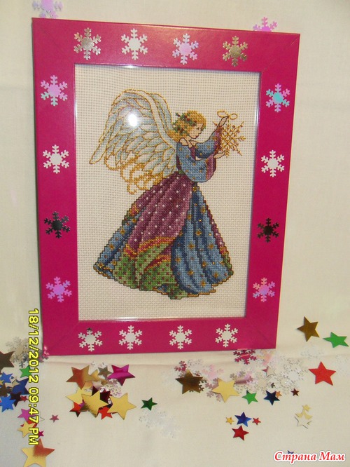 Вышила двух из четырёх рождественских ангелов в подарок племянницам на Новый год! Оформляла сама в готовые рамки, звёздочки и снежинки клеила на двухсторонний скотч. Процесс можно посмотреть у меня в альбоме https://www.stranamam.ru/album/4181551/