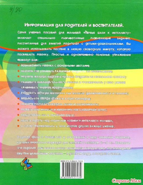Учебное пособие «Первые шаги к интеллекту. Развивающие задания для детей 4-5 лет» включает игровые задания для развития познавательных способностей детей: внимания, восприятия, памяти, воображения, логического и пространственного мышления. Эта серия книг мне очень нравится, особенно возможность разносторонне ее использовать.