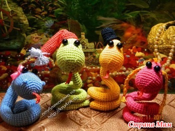После того, как хвост связан, нужно обмотать проволоку синтепоном и вставить ее в хвост. Согнуть змейку в спиральку или так, как Вам захочется! Пришить глазки-бусинки. Можно добавить к змейке аксессуаров, можно оставить как есть.