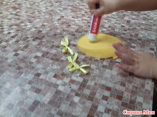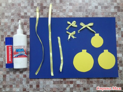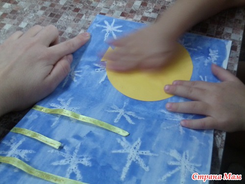 Теперь уже мама клеит бантики и снежинку на ленточки