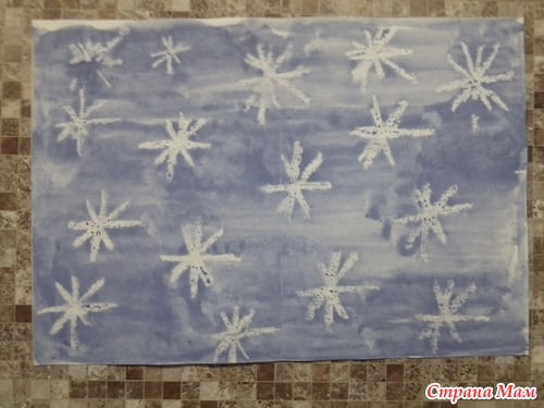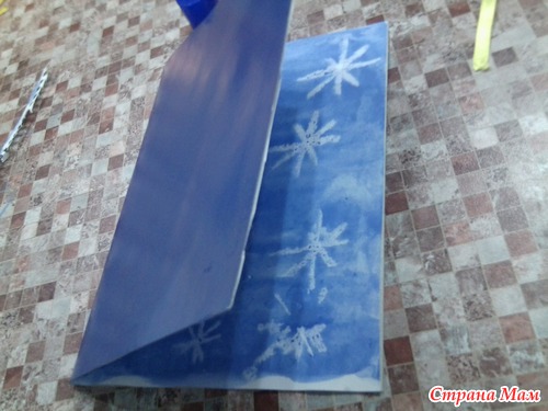 После того как высохнет, вклеиваем наш лист со снежинками в титульный синий картон
