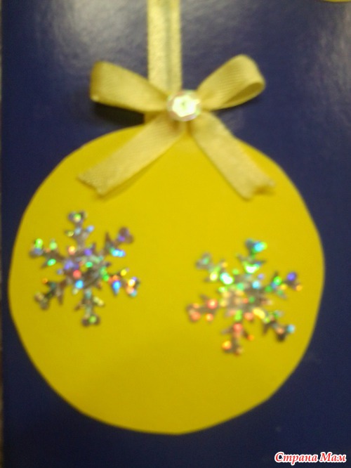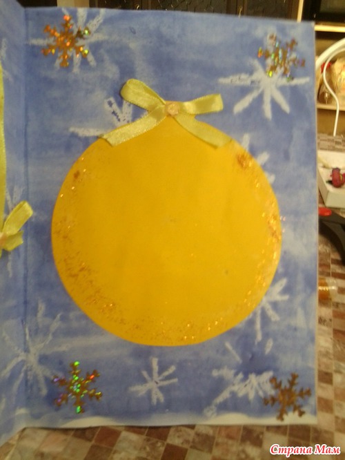 Теперь оформляем внутри. вырезаем из цветной бумаги большой елочный шар и вместе с ребенком клеим и оформляем снежинками и блестками