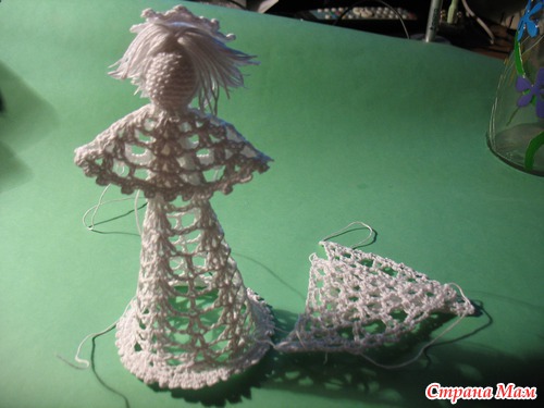 Связала ангелочка по частям. Накрахмалила части. А собрать -- никак. Дело в волосах было -- не могла сделать.