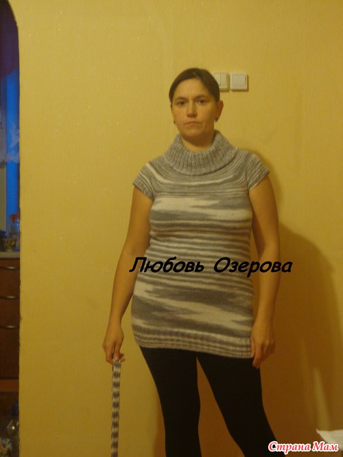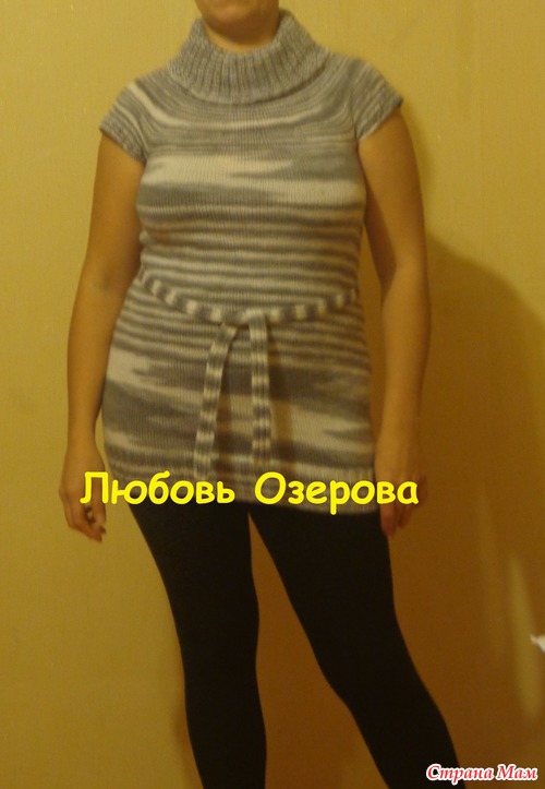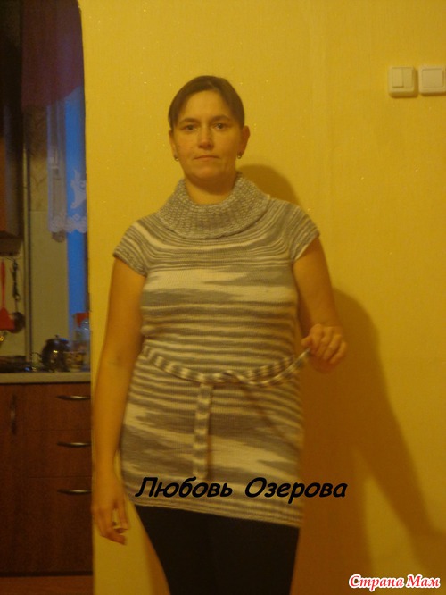 Вязала снизу одним полотном без единого шва. Набирала 232 петли и вязала резинкой 2х2, затем перешла на лицевую гладь. Дойдя до пройм, закрыла по 14 петель для каждого рукава, затем с помощью дополнительной нити набрала для рукавов по 70 петель и вязала опять по кругу. Далее равномерно убавляла петли для круглой кокетки. Когда на спицах осталось 160 петель, перешла на воротник. Затем обвязала рукава резинкой 2х2 на носочных спицах. Связала кушачок. Всё, туника готова.