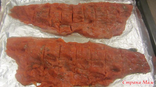 ) надрезаем поперек до шкурки (шкурку не прорезаем) солим, перчим, приправляем, поливаем лимонным соком