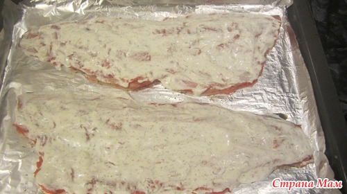Смешиваем сметану густую (у меня 25 %) и майонез 1:1, добавим зелени и смазываем обильно рыбку