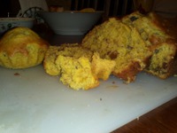 пюре тыквы, банан, яйцо, раст масло, сахар, соль, разрыхлитель, мука, орехи, изюм.