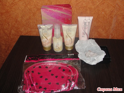 А теперь по-порядку. Ну это для меня. Замечательные крема, 2 косметички, и пополнение в моей коллекции-сережки и цепочка!!! Когда я их увидела, обомлела просто. Настолько они красивые!!! На Новый год обязательно буду в обновке!
