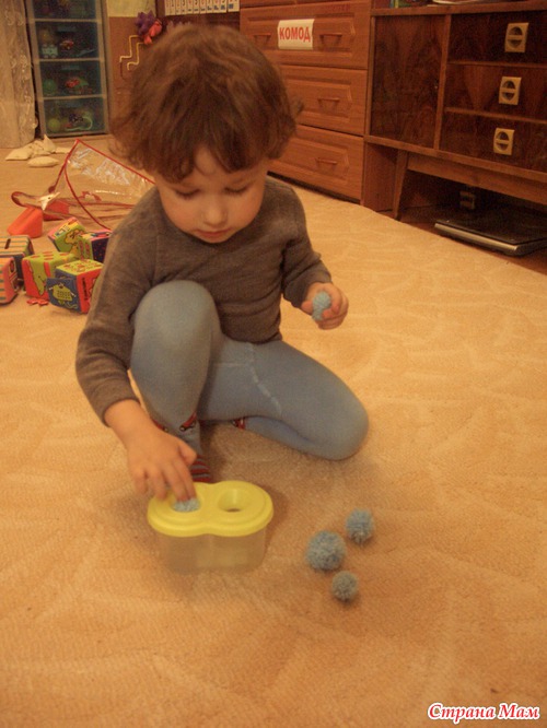 Замечательную игрушку я сделала для Елисюши. Очень долгоиграющую. Сделала бубончики из пряжи разного размера и дала баночку для кисточек. Надо было пальчиком бубончики впихивать в отверстия. Даже толстый бубончик Елик впихивал сам!!! Я была так рада!