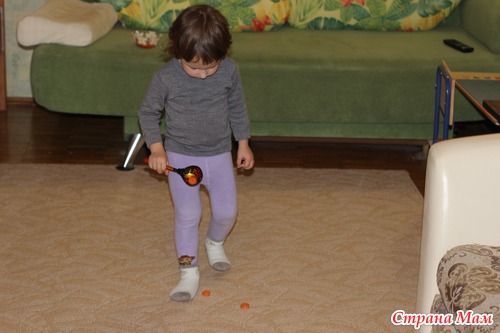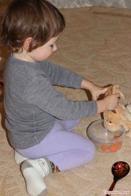 Кормили зайчика и мишку морковкой, ягодами. Надо было в ложке через комнату донести лакомство до игрушки и насыпать в тарелочку. Потом покормить