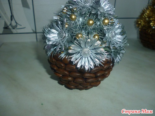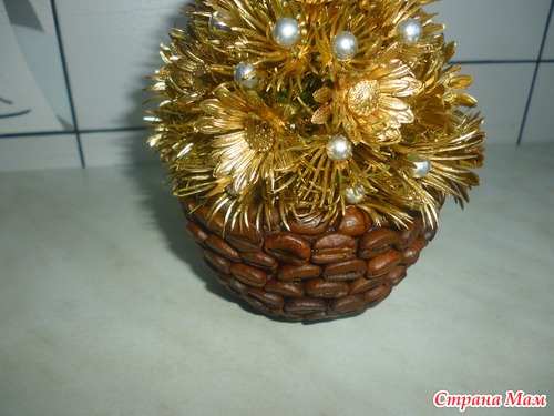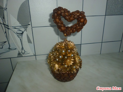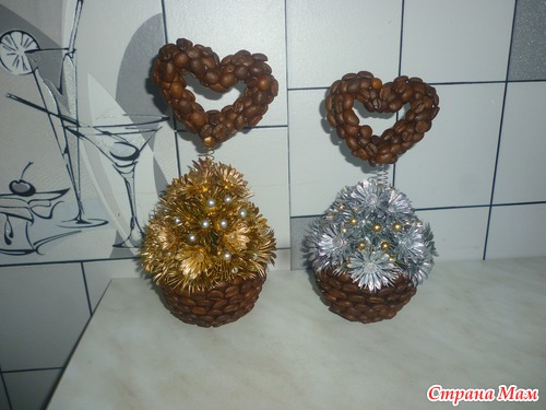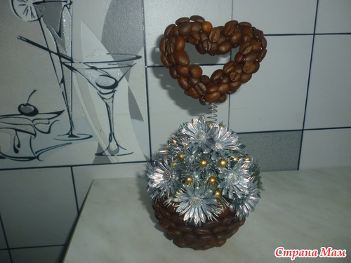 сердечко из проволоки,обклеенное зернами крепится на пружину.маленькая чашечка для соуса обклеена зернами.получилась мини корзинка.из пластмассовых цветов и бусин склеила такую горочку.на горячий клей приклеила внутрь пружинку с сердцем.покрыла краской из балончика.приклеила к корзинке и все...готово...