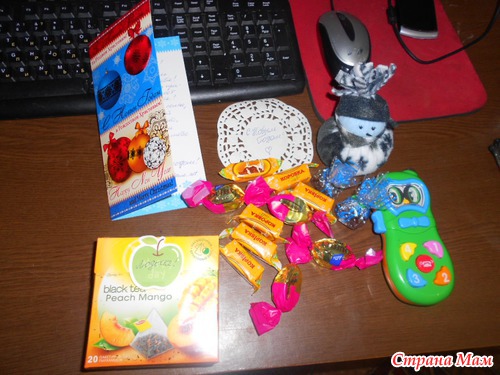 это общий вид. в коробочке мы нашли много очень приятных сюрпризиков, а именно говорящий телефон для Сони, она в восторге от него, таскает весь день играется! А мне мой любимый чаек и вкусные конфетки, одни были запечатаны ленточками, очень вкусные, я думаю что Даша их делала сама.