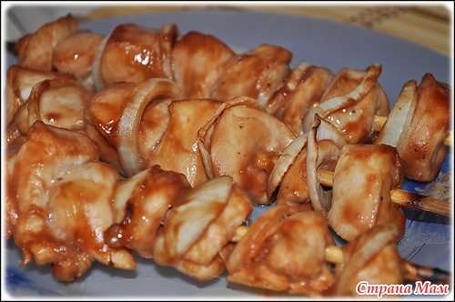 Кусочки курицы нанизываем на шпашки, чередуя с луком.