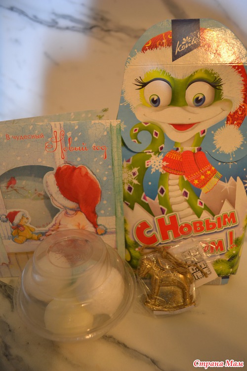 Ну и для всей семьи-открытка, с добрыми и приятными пожеланиями на НГ, сладкий подарок с обворожительной змейкой на упаковке-еще не открывали, и рождественская игрушка-свеча в виде лошадки, у дочи она называется нё-нё )))
