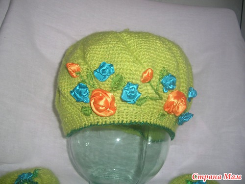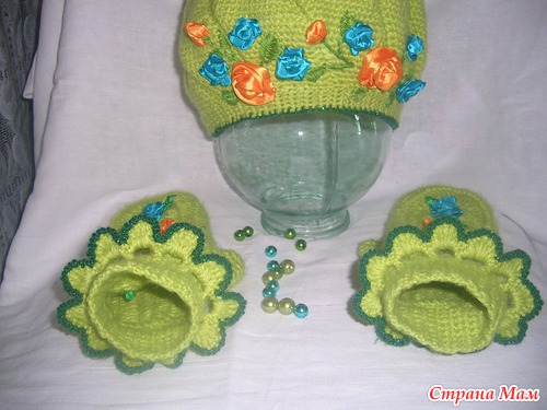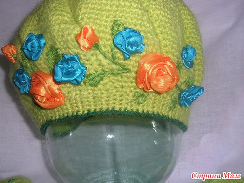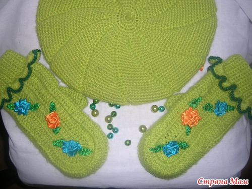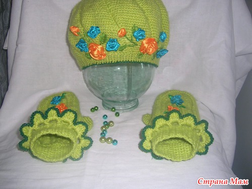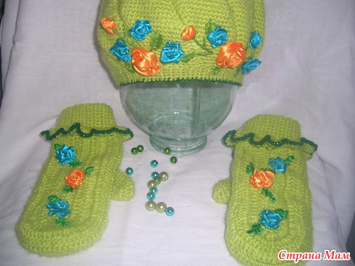 Ну вот в эти холодные вечера сязался вот такой комплектик для себя. Захотелось немного ярких красок добавить да и освоить попутно вышивку лентами. Вязалось из мохера и крокосбеда бразилии крючком№2.5