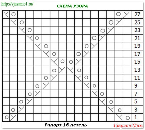 Полотнище: Наберите 98 петель (96 петель – ажурный узор + 2 кромочные) и вяжите 1 см платочной вязкой. Далее 15 см вяжите ажурным узором (схема внизу страницы). Петли оставьте открытыми, а работу отложите в сторону