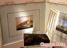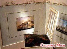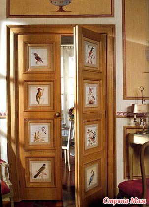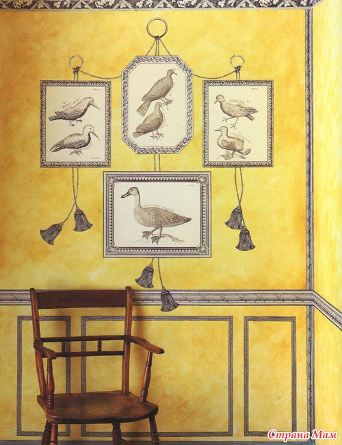 3. Эта комната, целиком оклеенная аппликациями в технике декупаж, стилизована «под зал графики». Выкрашенные в желтый цвет стены декорированы печатными имитациями филенок, рейки и фриза и тщательно подобранной композицией из эстампов с изображениями птиц, окаймленных рамками и связанных изящными бумажными шнурами с кистями.