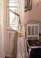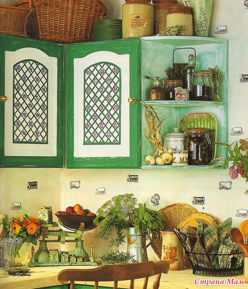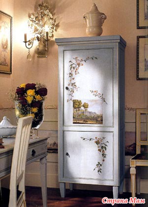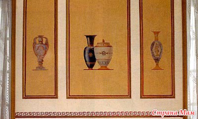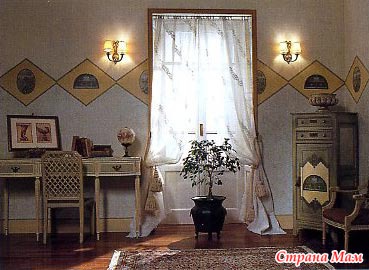 Возможности аппликаций почти безграничны, и вы убедитесь в этом, просмотрев представленные иллюстрации. Для этих помещений выбран неоклассический стиль - с севрским фарфором, дорогими гравюрами и старинными гербариями, чудесно сочетающимися с классической мебелью и антикварными безделушками. Элегантные аппликации на стенах добавляют солидности старой мебели и аксессуарам. Пастельные тона мебели гармонируют с тонкими аппликациями, чью красоту подчеркивают изящные бордюры, прорисованные акриловыми красками цветы и золотая кайма.