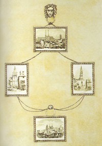 5. Поверхность, окрашенная сепией бледного, выцветшего оттенка, служит идеальным фоном для коллекции эстампов с видами французских деревень. Одинаковые рамки и переплетение шнуров, которые держит в зубах лев, придают композиции приятную для глаз симметричность.