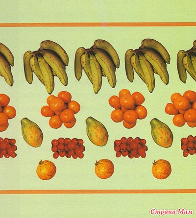 7. Красочные фотокопии спелых фруктов образуют оригинальный, радующий глаз фриз. Яркий цвет и оранжевые ограничительные линии на светло-зеленом фоне придают фризу современный вид.