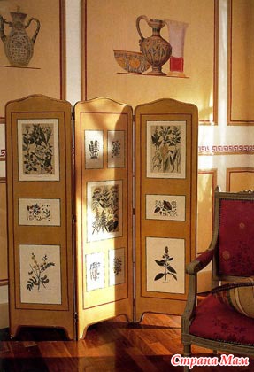 6. Классические виллы и сады в итальянском стиле стали центральным мотивом этой комнаты. На мебели - драгоценный фарфор, на ширме - странички из гербария.