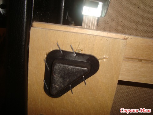 и чтобы выровнять ситуацию, не долго думая "мастера" раскрыли обивку и подложив под лапу ножку кусок свернутого картона? фанеры? закрыли обивку мебельным степлером и присобачили ногу обратно с помощью 4х шурупов, два из которых были ввёрнуты и вовсе мимо этого чего то" подложенного для уравновешивания сторон, поэтому ножка шаталась.