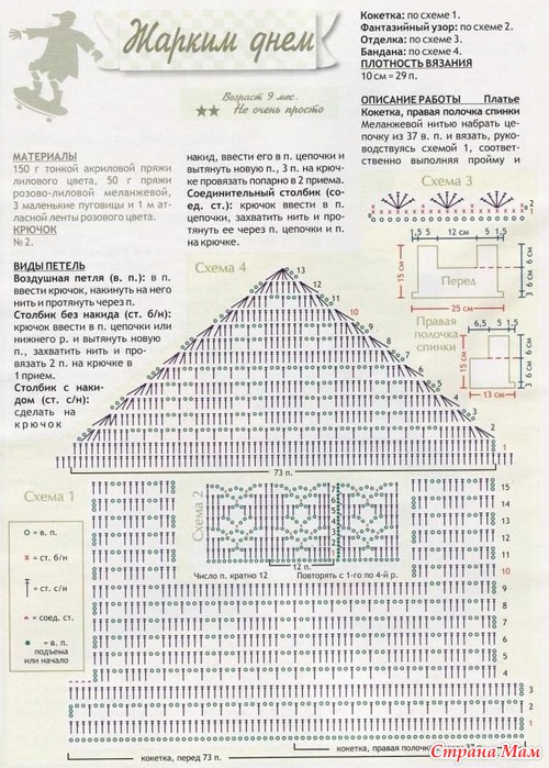 На просторах интернета нашла сначала сам сарафан и влюбилась, а схемы нигде не было, но долгие упорные искания привели меня к цели и вот он на моей девочке(Фотоальбом Дарья)!!! Прикрепила схемки, может кому пригодиться!!! Сиреневый сарафанчик вязала я!!! Читать полностью