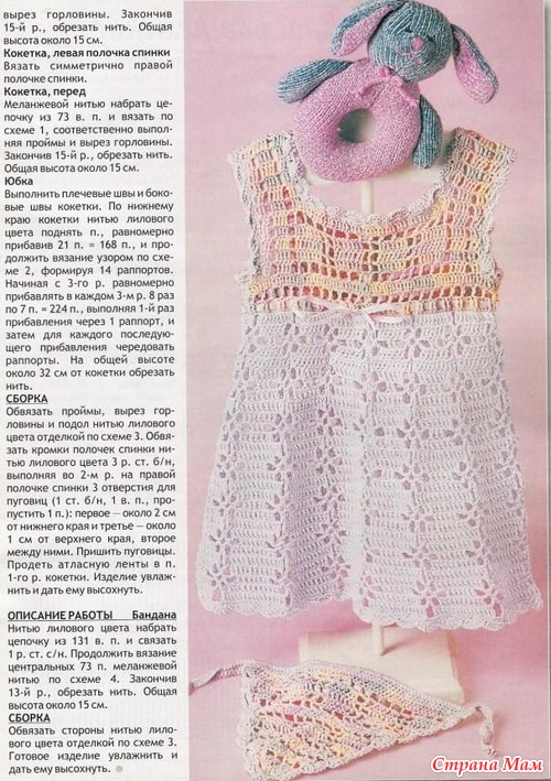 На просторах интернета нашла сначала сам сарафан и влюбилась, а схемы нигде не было, но долгие упорные искания привели меня к цели и вот он на моей девочке(Фотоальбом Дарья)!!! Прикрепила схемки, может кому пригодиться!!! Сиреневый сарафанчик вязала я!!!