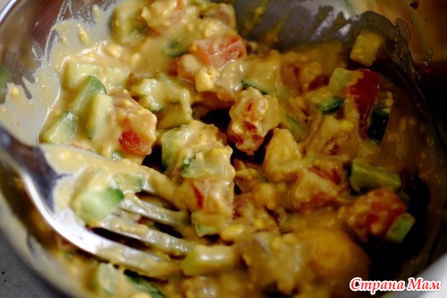 2) В глубокой миске смешайте желтки со всеми ингредиентами для фарша. Хорошо перемешайте. Добавьте 2/3 количества семги и огурцов. Еще раз перемешайте.