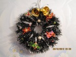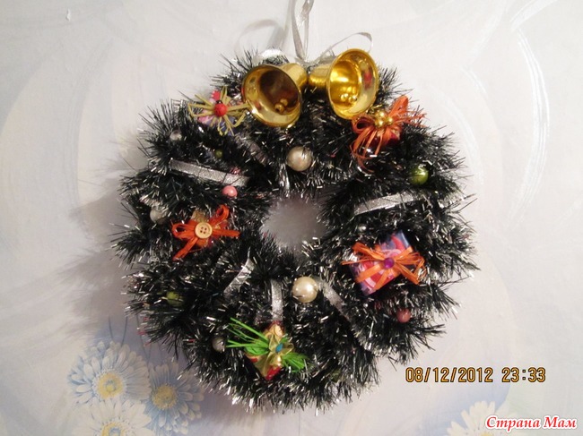 3. обматываем лентой и приклеиваем "подарочки", крупные бусины, я нашла 2 пластмассовых колокольчика. здесь всё ваша фантазия решает