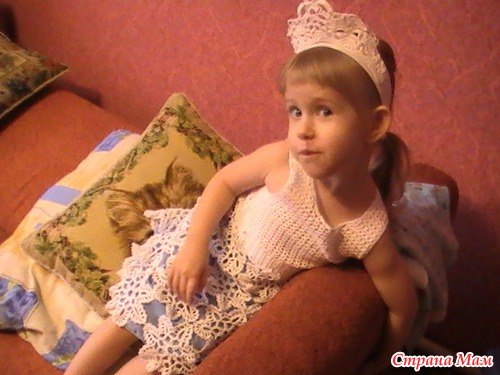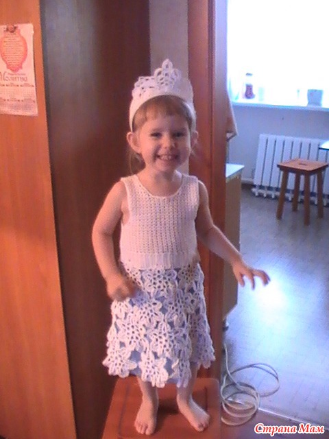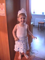 Вот и мы подготовились к утреннику в садик. Увидела вот здесь сарафанчик https://www.stranamam.ru/post/4326734/ Очень уж он мне понравился и решила я связать такой, только мотив взяла другой и кокетку тоже. Вязала крючками №1;1,5 и 2 нитки сосо - кокетка и ярнарт виолет - юбка. Для увеличения снежинок меняла крючки на большие. Подклад - шифон
