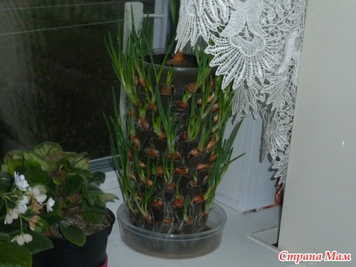 У меня мама в детстве ставила лук на банку с водой, но так много зеленого лука не получишь, да и места много занимает (если несколько баночек поставить. А так получается много зелени, и места мало занимает, да еще и симпатично.