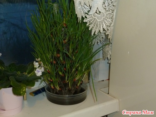 У меня мама в детстве ставила лук на банку с водой, но так много зеленого лука не получишь, да и места много занимает (если несколько баночек поставить. А так получается много зелени, и места мало занимает, да еще и симпатично.