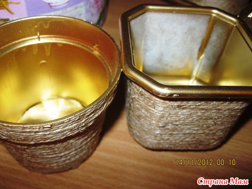 Сначала подготовим горшок для "домашнего" деревца. Я обмотала его шпагатом (очень люблю этот материал!), закрепляя клеем ПВА. Затем покрасила внутри и край горшочка золотой краской. Заодно покрасила камушки для аквариума, чтобы закрыть ими поверхность гипса.