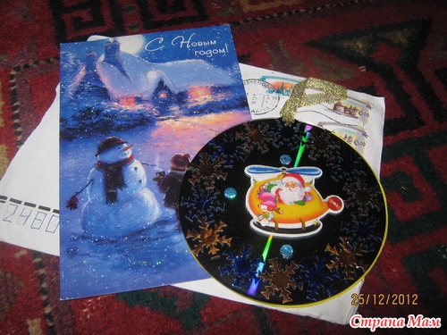 это от Яночки Толокновой (ник- яник) кпрасивая открыточка и самодельная подвеска из диска