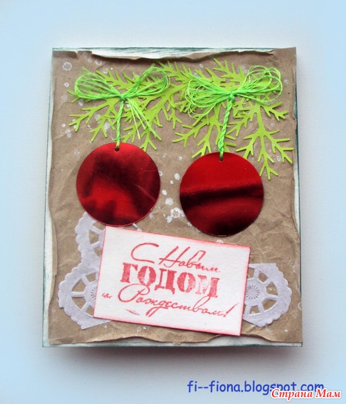Совсем простые открытки на краф-бумаге, забрызганной белой краской. Вырубка-веточки, шарики... Правда, на первой открытке голографические шарики превратились в зимние вишенки